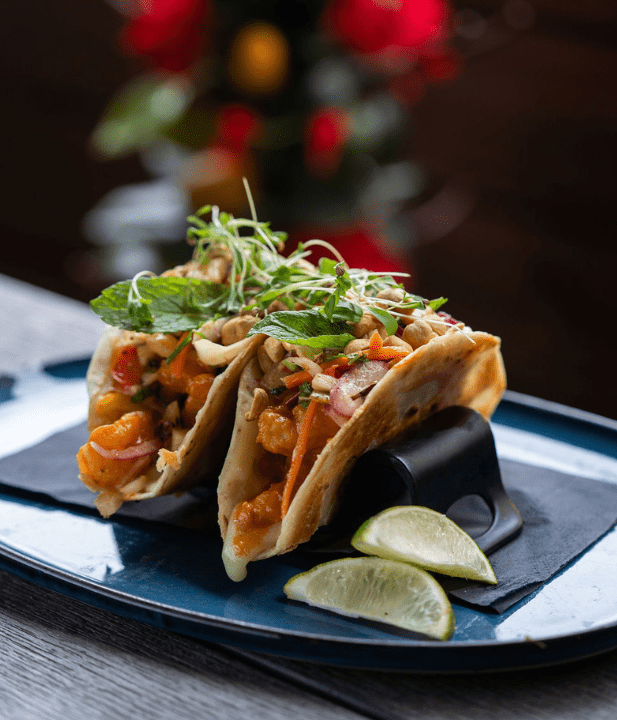 The taco of the month at Dahlia Kitchen + Bar is Bang Bang Shrimp made with tempura shrimp, bang bang sauce, napa cabbage slaw, green onion curls and peanuts.