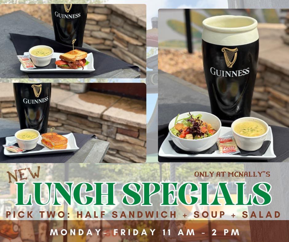 McNally’s Irish Pub has a new $11 lunch special that’s a pick-two combo. Get a grilled cheese, BLT or hot Rueben; soup of the day; or garden salad.