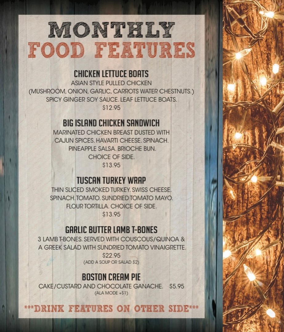 January’s featured menu at Tinner’s Public House might make you feel like you’re on vacation. Start in Asia with chicken lettuce boats, head to the islands with the Big Island chicken sandwich, stop in Italy for the Tuscan turkey wrap, visit Greece for the garlic butter lamb T-bones and finish it on the East Coast with a slice of Boston cream pie.