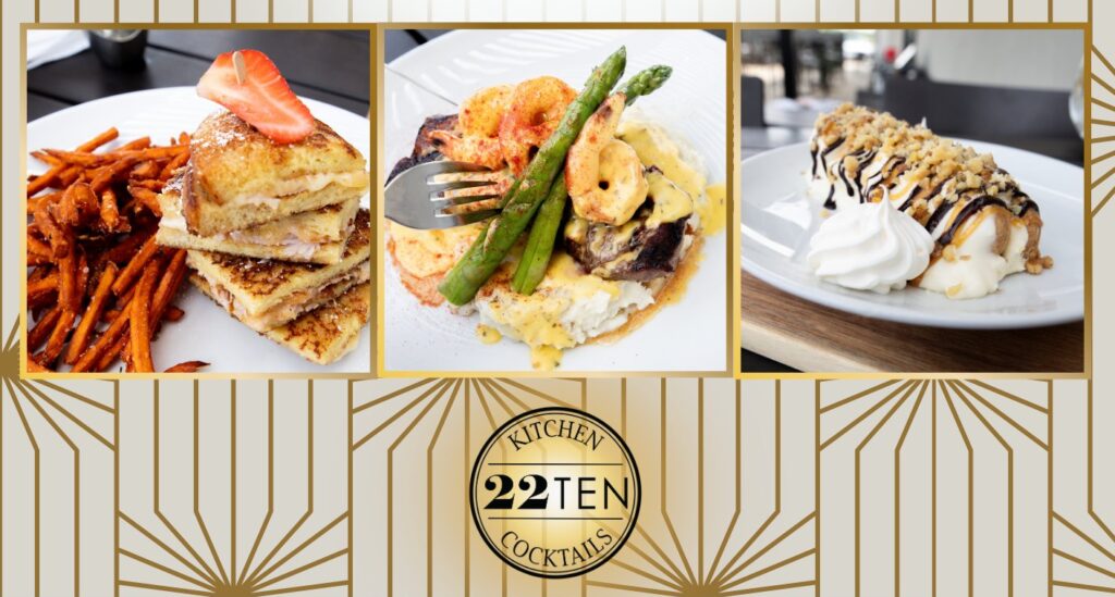 The regular menu at 22Ten Kitchen Cocktails has a few additions. Muffin Top Salad features blueberry muffin croutons, and Lettuce Wraps include chicken, veggies, fried rice noodles and scallion caramel soy sauce on romaine hearts. There’s also a monte cristo sandwich, Oscar-Topped Ribeye and a Walleye Signature Dinner of lightly dusted and grilled walleye with parmesan butter roasted root vegetables, honey and charred lemon. For dessert, there’s a new Chocolate Brownie Souffle and a Turtle Tiramisu.