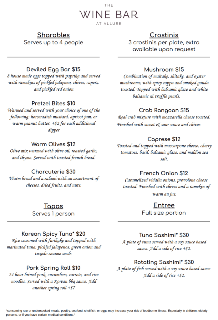 The Wine Bar at Allure has a new food menu, keeping the focus on light bites. There are sharables, including a revamped charcuterie board, tapas and crostinis. It also has new weekly specials: Tuesday, buy one domestic beer and get a second for half-price; Wednesday, 10 percent off tuna sashimi; Thursday, half-price pretzel bites; Friday, buy one crostini dish and get a second for 20 percent off; and Saturday, mimosa flights for $25.