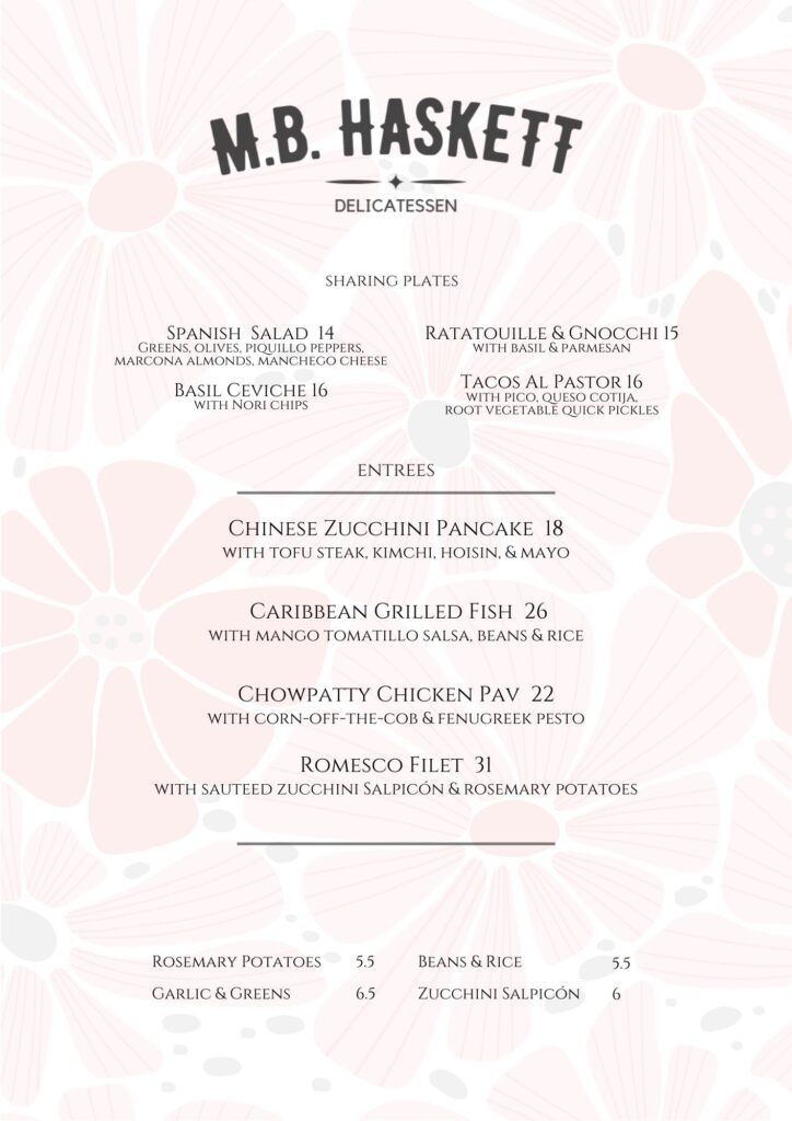 Here’s the latest dinner menu from M.B. Haskett Delicatessen. In addition to seating inside, the downtown restaurant features patios in the front and back. Dinner hours are 3:30 to 9 p.m. Thursday and Friday and 5 to 9 p.m. Saturday. It’s also open for breakfast and lunch every day except for Monday.