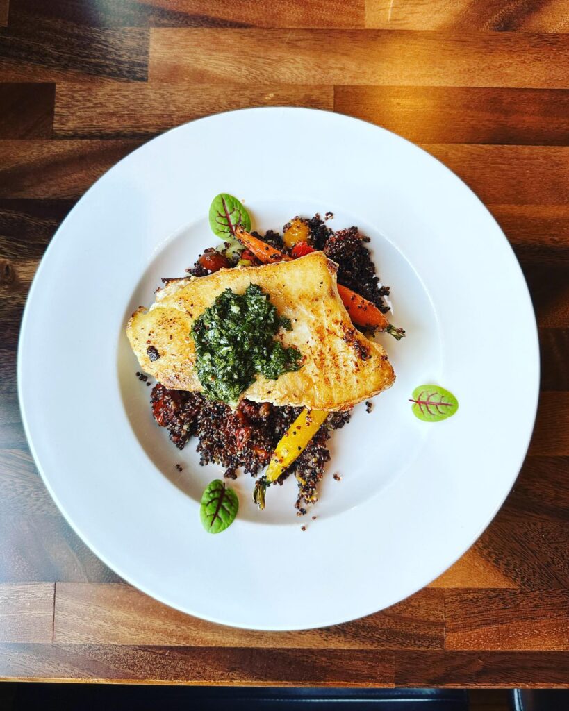 The monthly features at R Wine Bar & Kitchen for August doubled up on desserts. There’s a key lime cheesecake and banana split creme brulee. The featured entree is a swordfish steak pan-seared with garlic compound butter and served with chimichurri, lemon, micro baby carrots and tomato confit red quinoa.