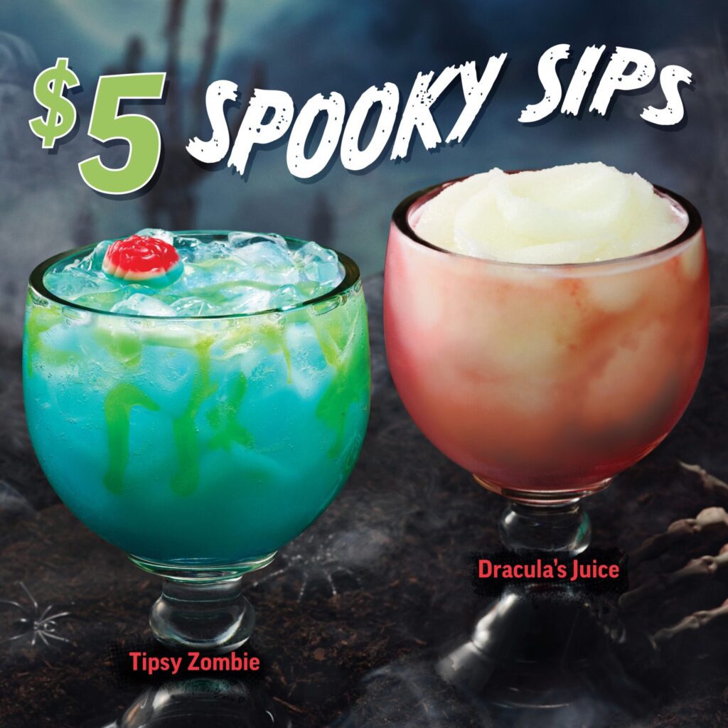 Spooky Sips are back at Applebees through Halloween. For $5, choose Dracula’s Juice with Barcardi Superior Rum and Jose Cuervo Gold Tequila or the Tipsy Zombie, featuring Barcardi Superior Rum, melon liqueur and tropical flavors.