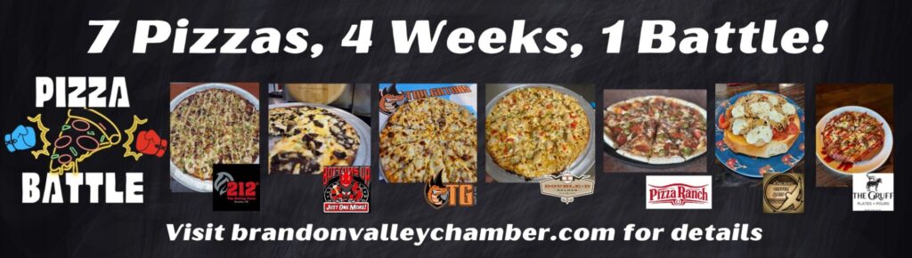 Seven Brandon restaurants are competing in the Brandon Pizza Battle, which runs through October. Bottoms Up features the Midwest, Double D Saloon has the Hot Honey Pizza, 212 The Boiling Point created The Golden Clucker, The Gruff Plates + Pours crafted the Truffalooo, Kingbird Coffee has Liberty’s Lottza Mottza, Pizza Ranch entered its Bucking Bronco and Tailgators Grill & Bar has the Tailgators Breakfast Pizza. For a description of each offering and to vote for your favorite, go to brandonvalleychamber.com/pizza-battle.