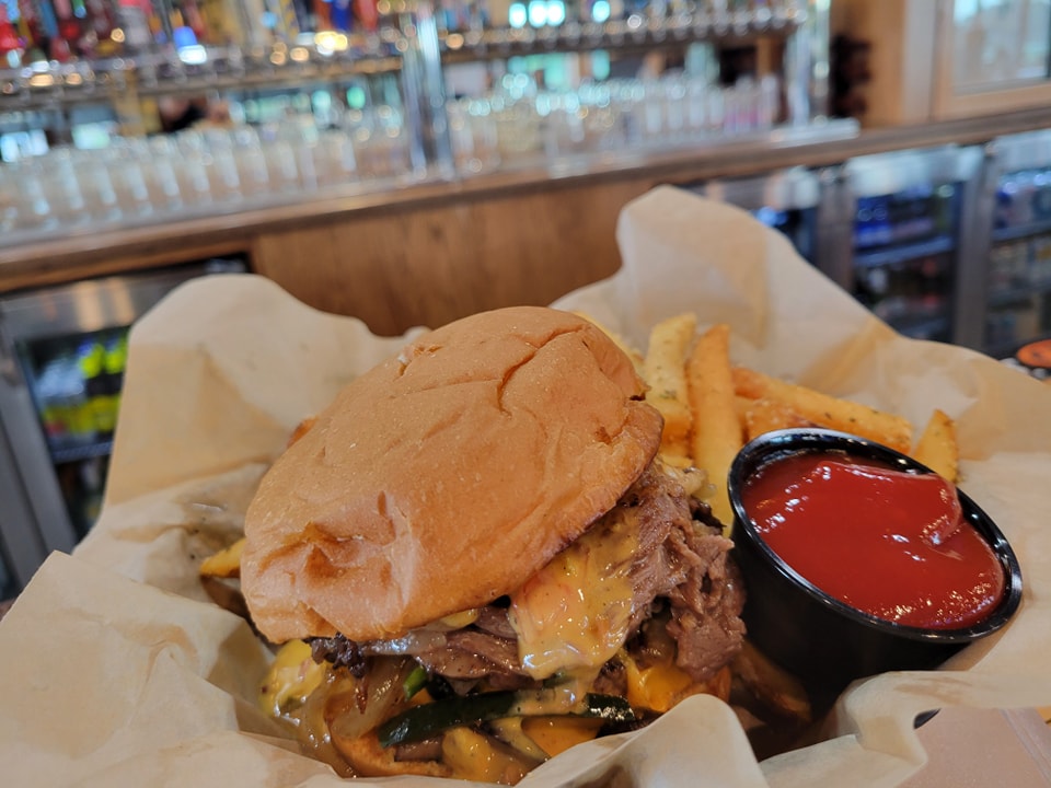 At Crooked Pint Ale House, the lucy of the month for October is the Cheesesteak Lucy. The American cheese-stuffed patty is topped with more American cheese, sauteed onions, poblano peppers, mushrooms, sliced prime rib and queso con carne sauce.