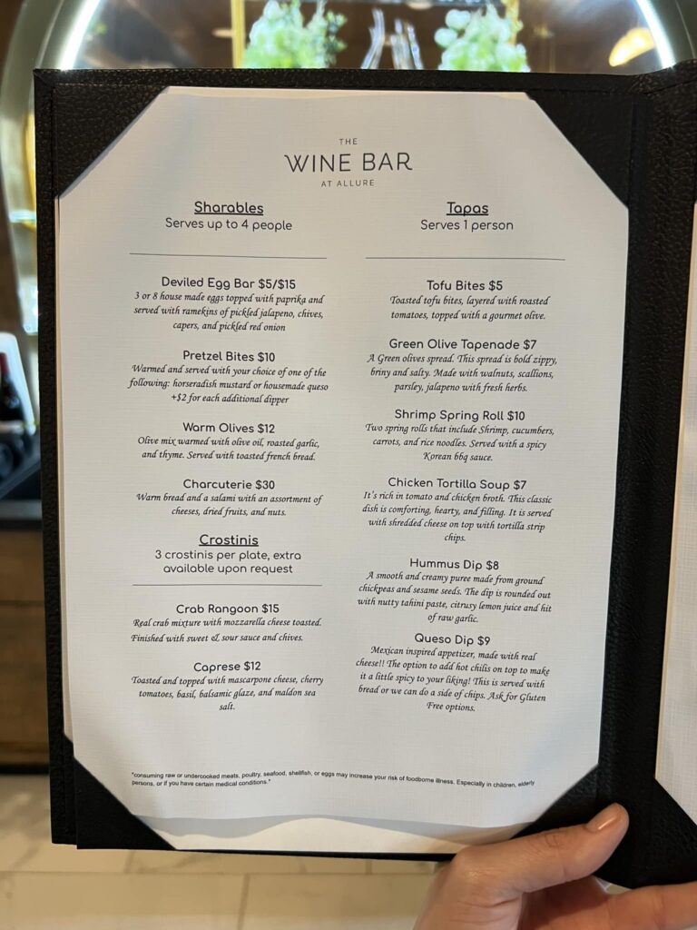Now that The Wine Bar at Allure has a liquor license, it’s crafting autumn drink features. The Maple New York Sour features Makers Mark whiskey with sweet and sour, and a maple simple syrup. The Spiced Honey Bourbon Old-Fashioned features Basil Hayden bourbon with a spiced honey simple syrup and a candied rosemary garnish.