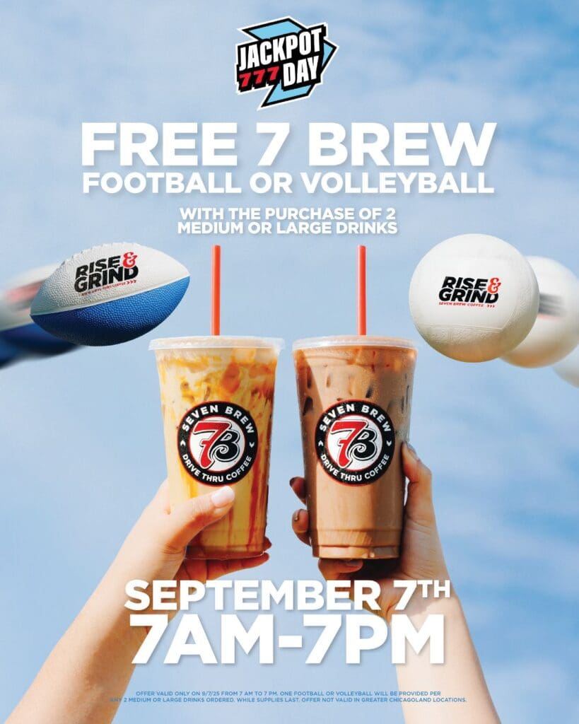 7 Brew Coffee celebrates Jackpot Day on the seventh day of the month from 7 a.m. to 7 p.m. with a special that changes every time. Sunday, customers who buy two medium or large drinks will get a free football or volleyball while supplies last.