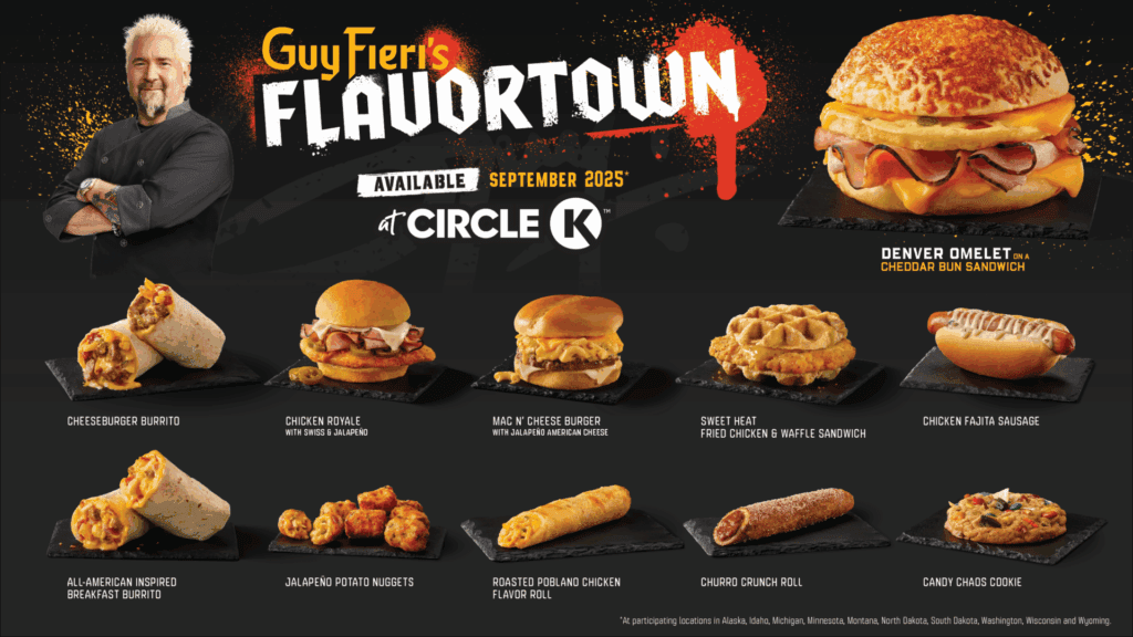 Celebrity chef Guy Fieri has partnered with Circle K to sell exclusive Flavortown breakfast, lunch, dinner and snacking options. Among the 11 offerings are the Mac N’ Cheese Burger, Sweet Heat Fried Chicken & Waffle Sandwich, Denver Omelet on a Cheddar Bun Sandwich and the Candy Chaos Cookie with candy pieces, chocolate chips, potato chips, peanut butter chips, pecans and pretzels. “This collaboration is about redefining what people can expect from convenience store food, demonstrating our commitment to innovation and listening directly to our customers’ cravings for high-quality, flavorful options on the go,” a Circle K executive said in a news release.