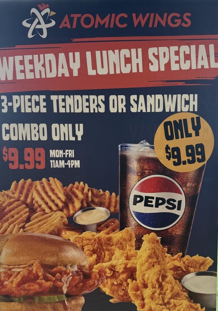 Atomic Wings has a new weekday lunch special. For $10, get a combo meal with three tenders or a chicken sandwich. Lunch hours are 11 a.m. to 4 p.m.