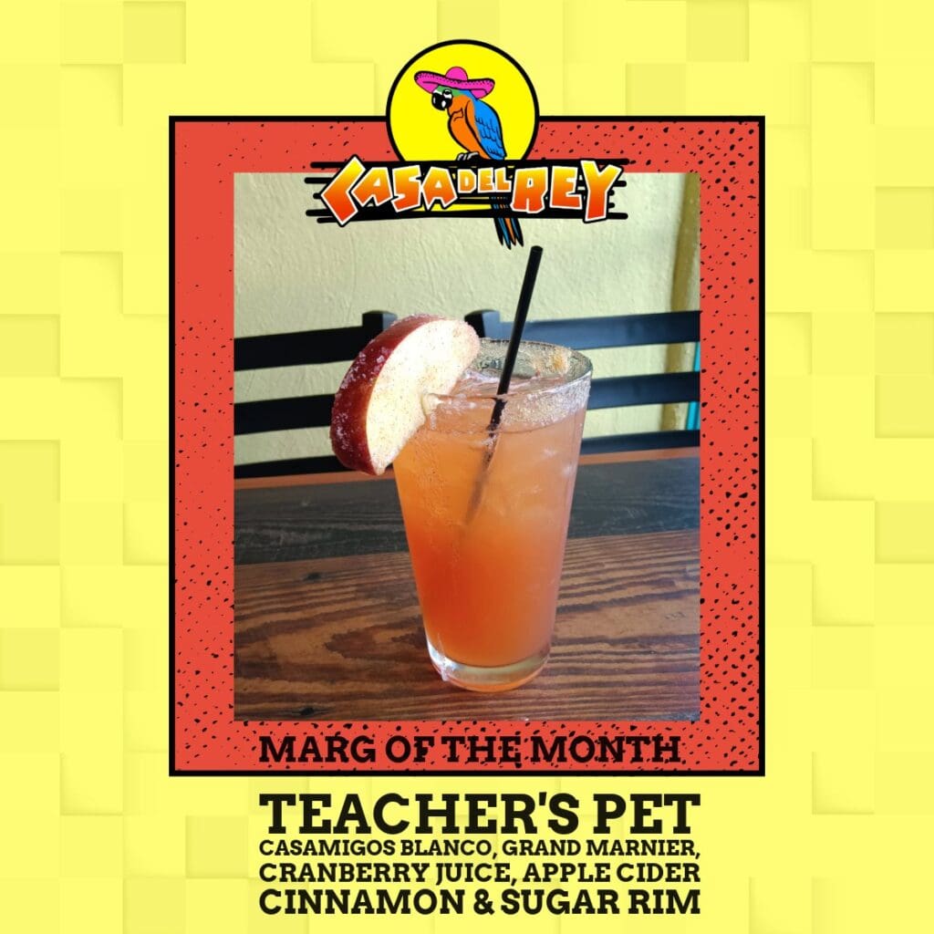 The September margarita of the month at Casa del Rey is Teacher’s Pet with Casamigos Blanco tequilla, Grand Marnier, cranberry juice, apple cider and a cinnamon-sugar rim.