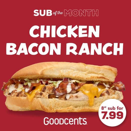 The sub of the month at Goodcents is Chicken Bacon Ranch. Get the toasted favorite for $8.