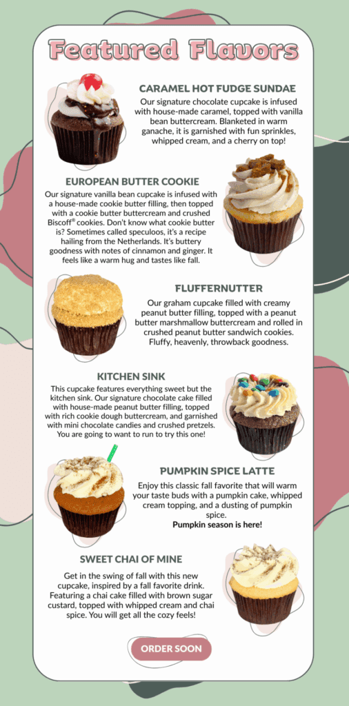 Featured cupcake flavors for September at Oh My Cupcakes are Sweet Chai of Mine, European Butter Cookie, Kitchen Sink, Pumpkin Spice Latte, Fluffernutter and Caramel Hot Fudge Sundae.