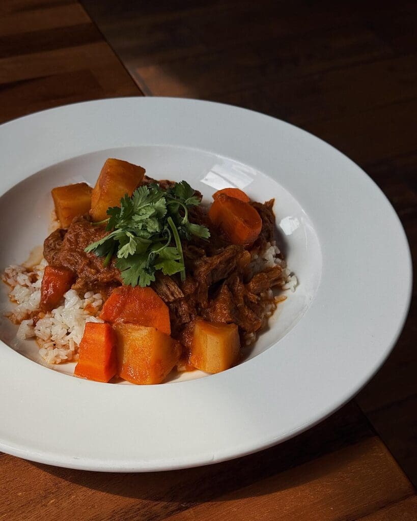 Featured dinner menu items for September are available at R Wine Bar & Kitchen. Hilachas is a Guatemalan shredded beef stew in a tomato and tomatillo sauce with potatoes and carrots, served on a bed of rice. Desserts are apple crisp and gluten- and dairy-free tres leches.