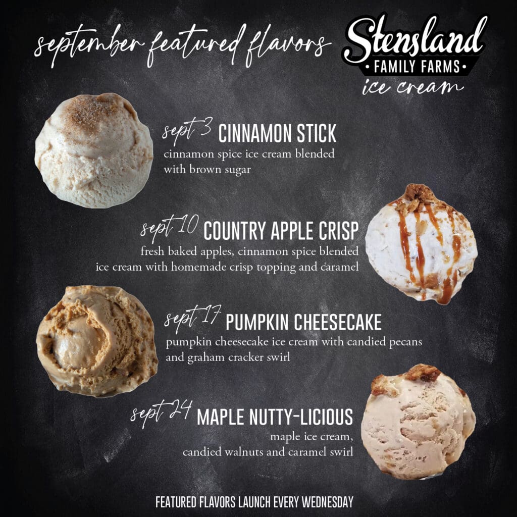 Check out the weekly featured ice cream flavors for September at Stensland Family Farms.