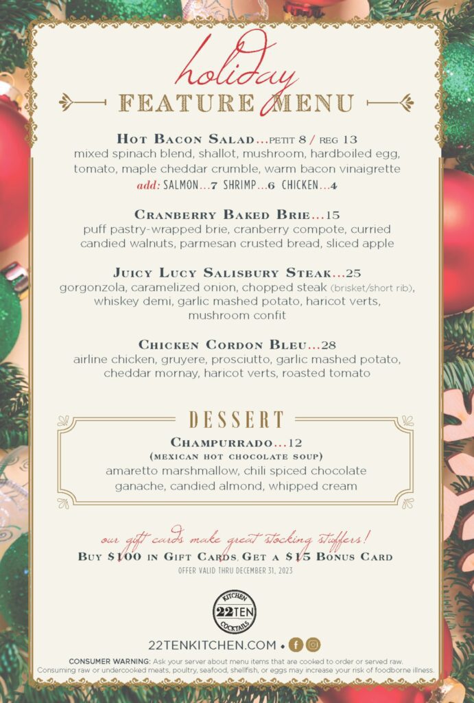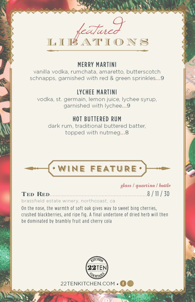 22Ten Kitchen Cocktails released its holiday feature menus for food and cocktails earlier this week.