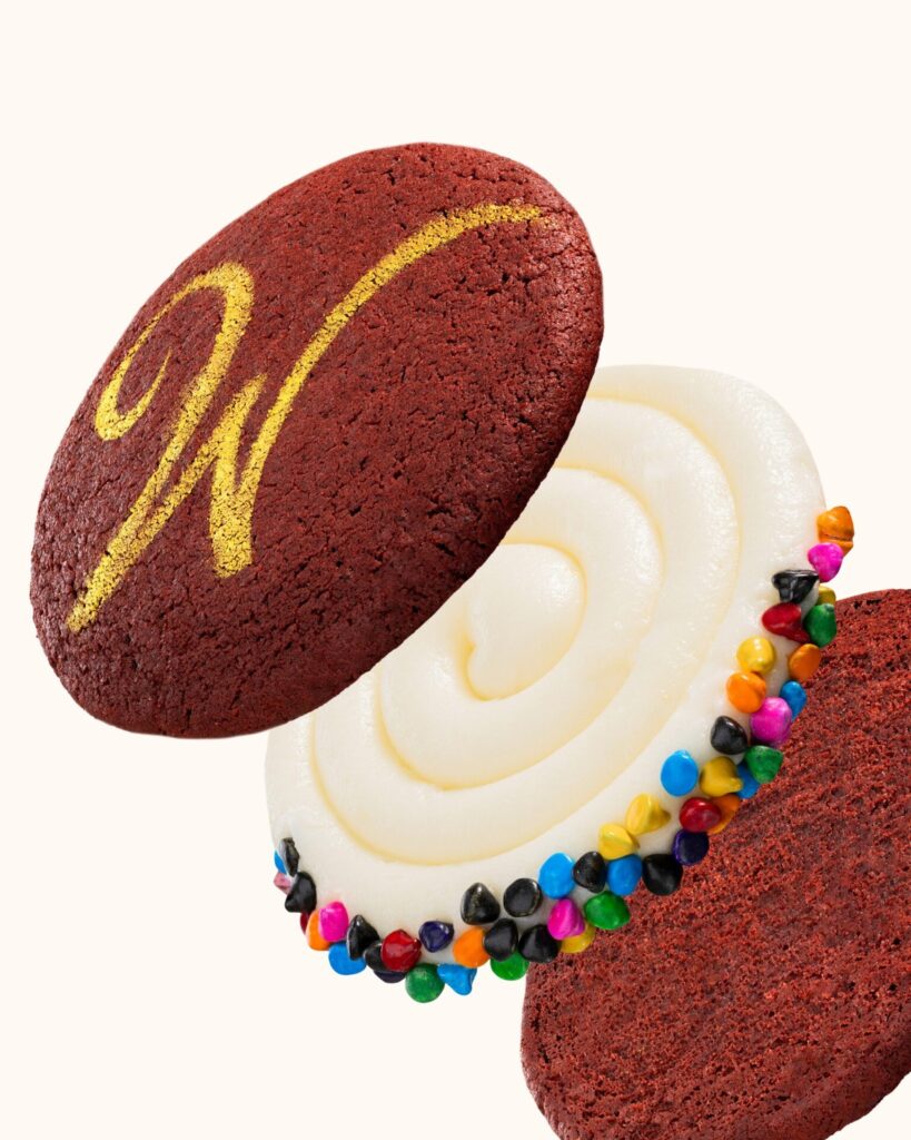 Crumbl Cookies has a special cookie this week for the premier of “Wonka.” It’s a red velvet sandwich cookie with vanilla cream cheese frosting that’s rolled in rainbow candy-coated chocolate chips and topped with a gold-dusted W.