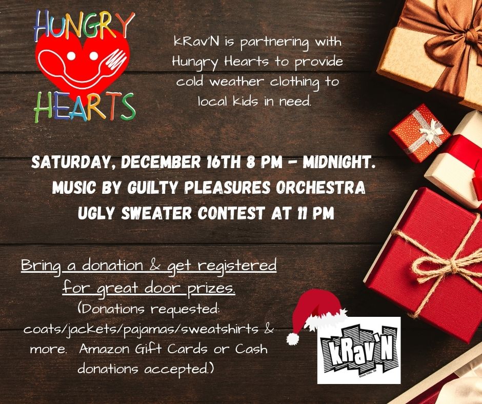 Krav’n is hosting an ugly sweater party Saturday to collect donations for Hungry Hearts. Donate coats, pajamas, sweatshirts or similar items to get registered for door prizes. Amazon gift cards or cash donations also will be accepted. The party starts at 8 p.m. with music by the Guilty Pleasures Orchestra. Ugly sweaters will be judged at 11 p.m. If you can’t make the party, drop off a donation anytime this week.