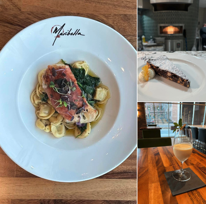 Maribella Ristorante’s featured entree for December is Pollo Saltimbocca. It’s a prosciutto-wrapped chicken breast stuffed with fontina and sage that’s served with three-cheese tortellini, wilted spinach and a brown butter sage sauce. The featured dessert is panforte, a traditional Italian holiday fruit cake. The featured cocktail is Baciami, with Branca Menta, green Chartreuse, creme de cacao, cream, sugar and chocolate bitters.