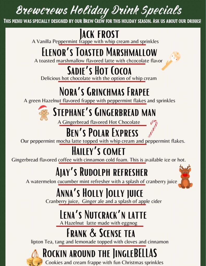 Check out the holiday drink menu for Yakkity Yak Coffee Shack in All American Gymnastics Academy on South Cliff Avenue. The drinks are named after members of the Brew Crew staff. If you stop by Saturday morning, you’ll find Santa and the weekly all-you-can-eat waffle bar. Earlier this fall, the coffee shop received a 2023 Governor’s Award for “outstanding achievements in improving employment opportunities for people with disabilities.”