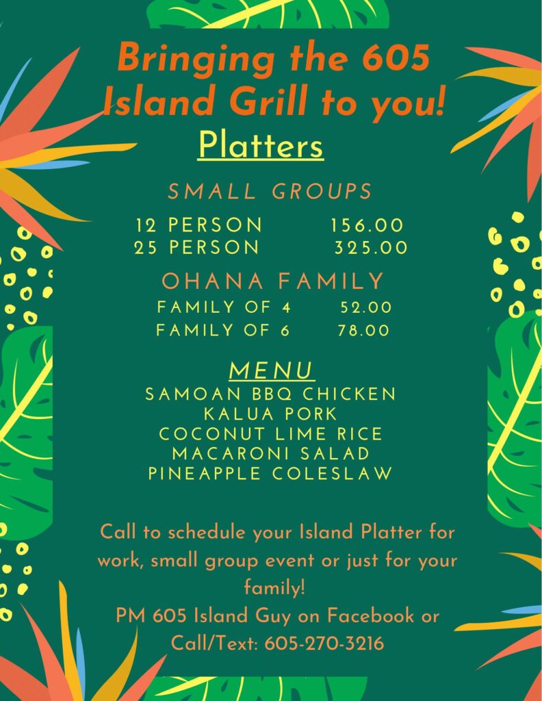 The new food truck 605 Island Guy has added family-size and small group catering platters. They’re available for delivery or pickup.