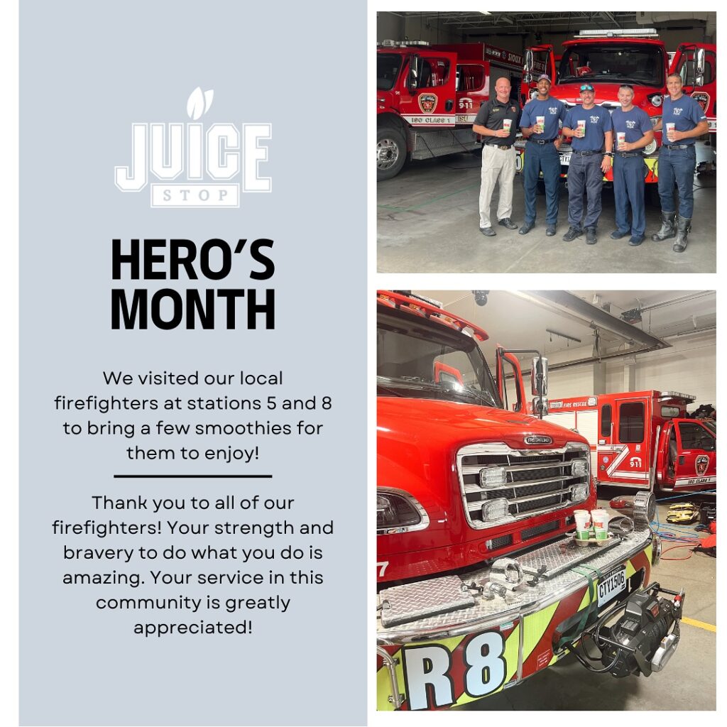 Juice Stop is celebrating Hero’s Month by giving all local heroes $1 off 24-ounce smoothies through September. It’s also making drop-offs throughout the month.