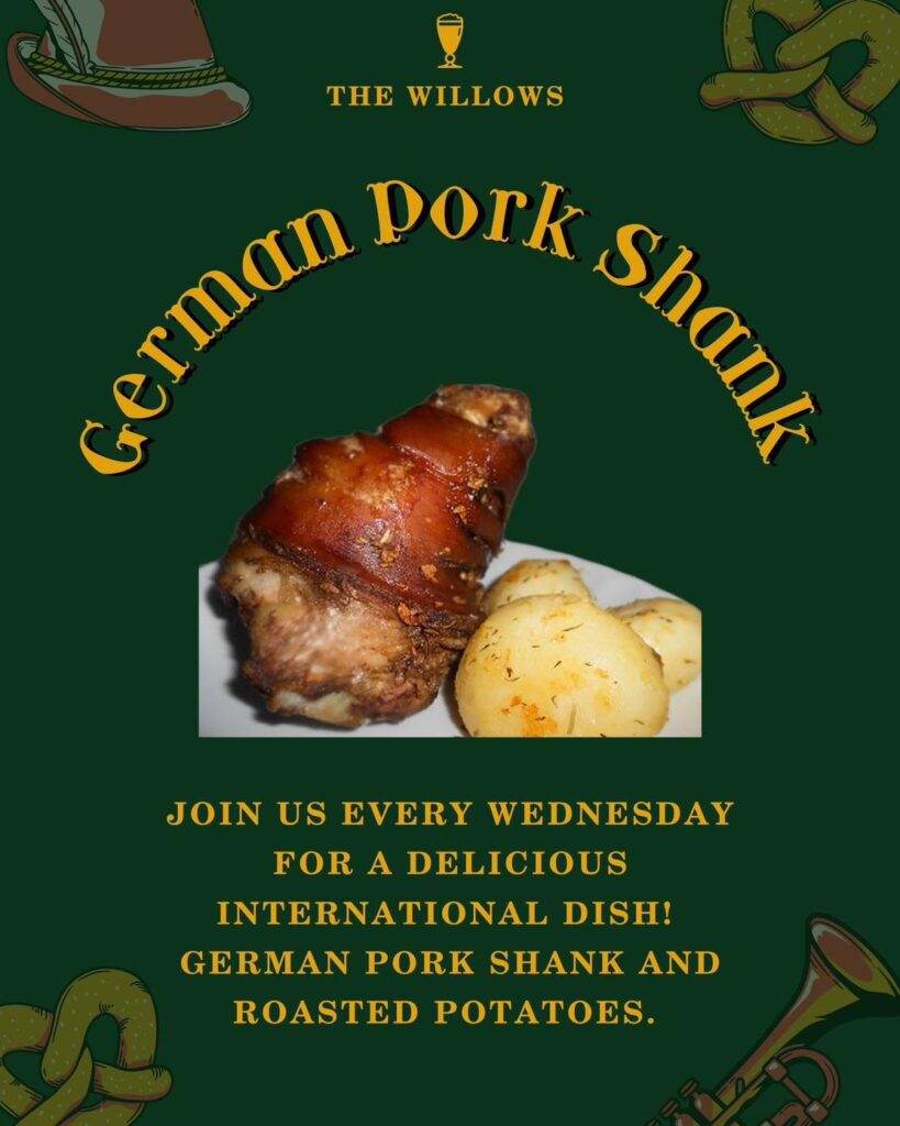 This month’s international dish at The Willows is a German pork shank with roasted potatoes. It’s served every Wednesday night.