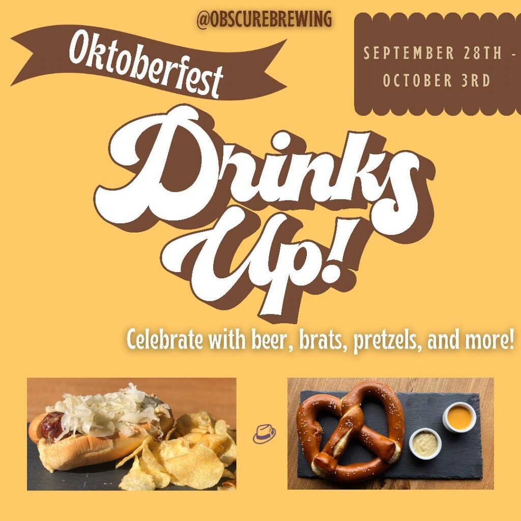 Obscure Brewing Co. is celebrating Oktoberfest on Saturday with the tapping of its last keg of Oktoberfest Festbier. Special menu items, which are available all week, include jumbo pretzels with beer cheese and mustard, sauerkraut brats and a warm side of German potato salad. Two rounds of stein-holding competitions will begin at 5 and 8 p.m.