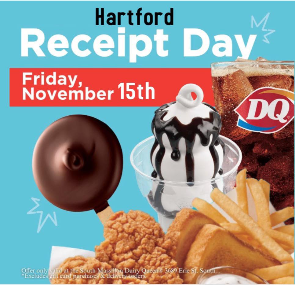 Here’s a deal that might be worth the two trips to Hartford. Friday is Receipt Day at the community’s DQ Grill & Chill. The amount you spend that day will be taken off your next order before Nov. 30.