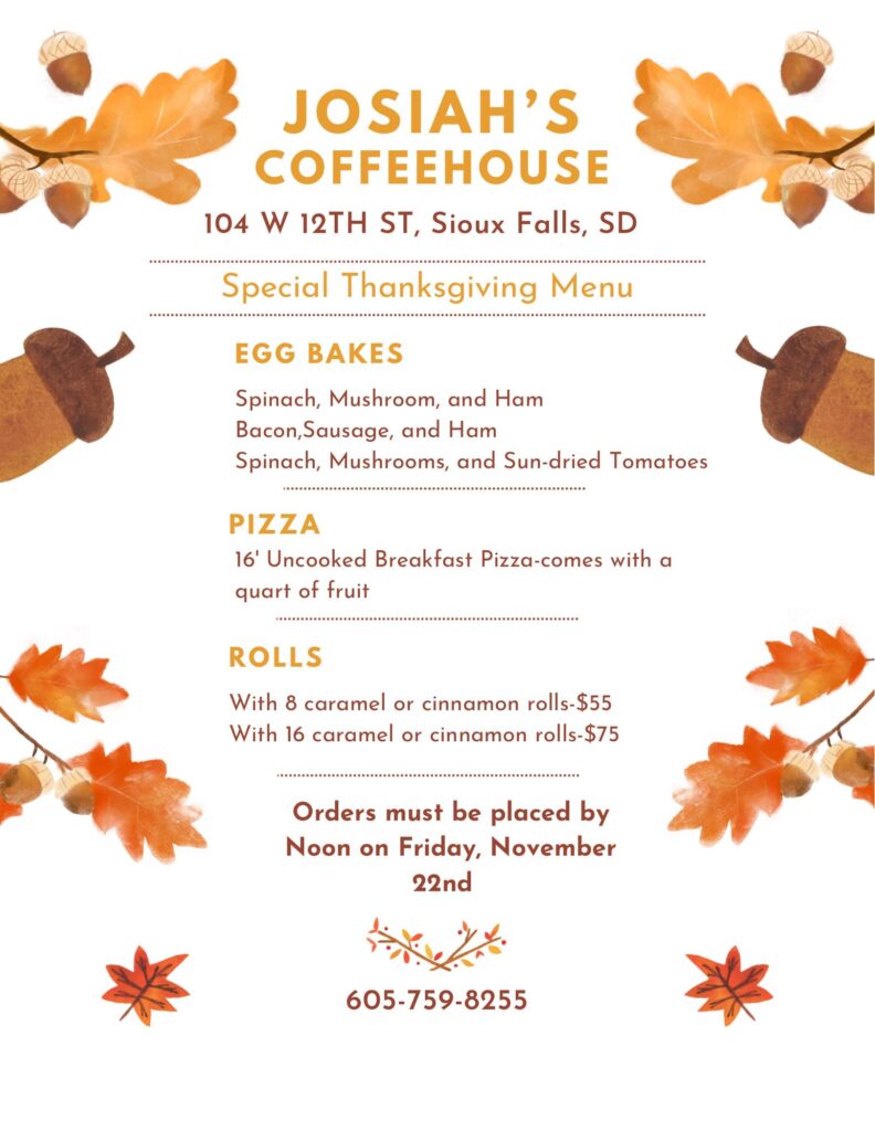 Josiah’s Coffeehouse, Cafe & Bakery is offering its annual to-go breakfast menu for Thanksgiving with egg bakes, breakfast pizza and rolls. Pies also are available. Orders must be in by noon Nov. 22.