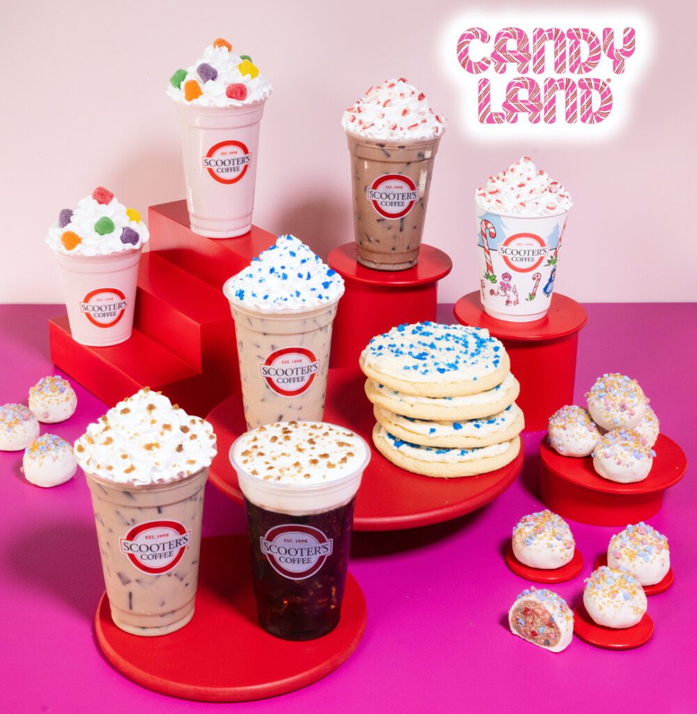- Scooter’s Coffee: Candy Land-themed drinks and treats like the Queen Frostine Sugar Cookie Latte and Sugar Cookie, Gramma Nutt Latte and Cold Brew, Mr. Mint Mocha and kids Hot Chocolate, Jolly Gumdrop Smoothie and kids version, and King Candy Cake Bites.