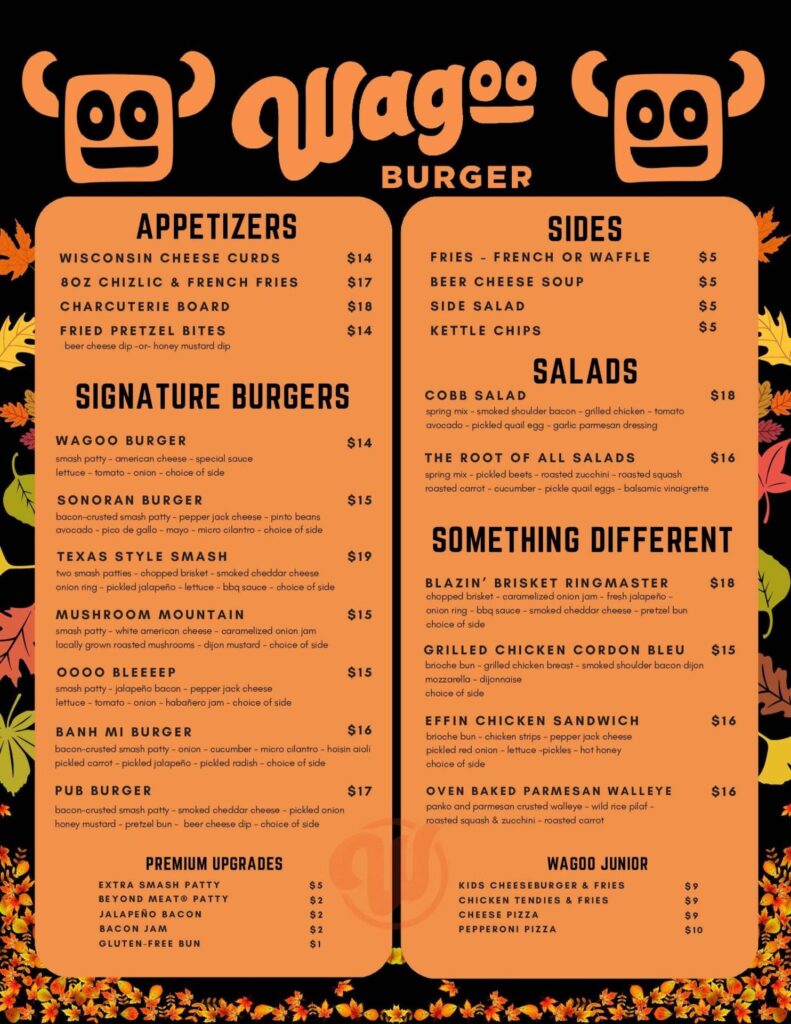 Wagoo Burger has revamped its menu for winter. New offerings for lunch and dinner include a charcuterie board, fried pretzel bites, the Pub Burger, salads, all the “Something Different” items and pizza on the kids menu. For breakfast, the Egg Smack menu includes the new Smokey Sunrise and a Breakfast Burrito.