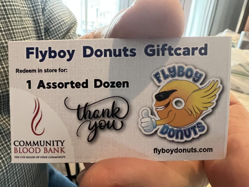 Donate blood Friday at Flyboy Donuts, and get a gift card for a free dozen doughnuts. Bloodmobiles will be parked at the shops on East 10th Street and at The Bridges at 57th. Follow the links to register for a time slot.