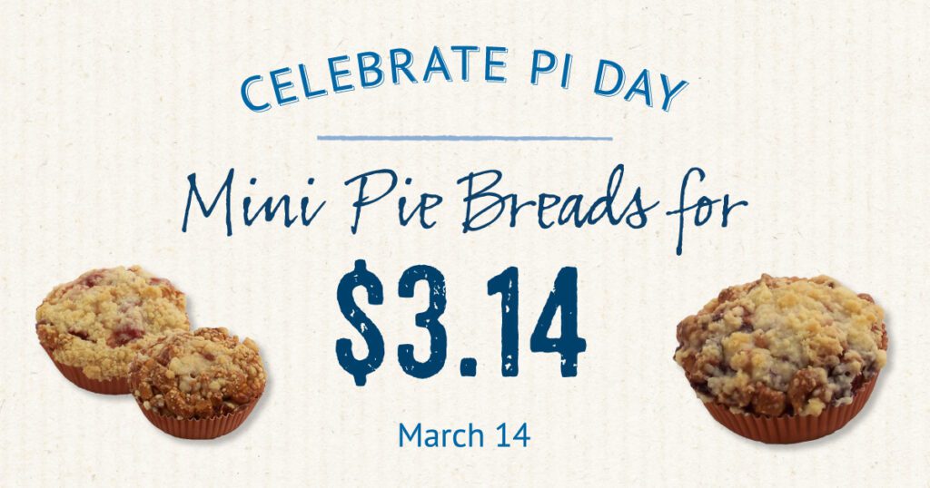 To celebrate Pi Day on March 14, Breadsmith is baking mini pie breads in apple, blueberry and cherry, and selling them for $3.14. Advance orders are recommended at breadsmith.com.