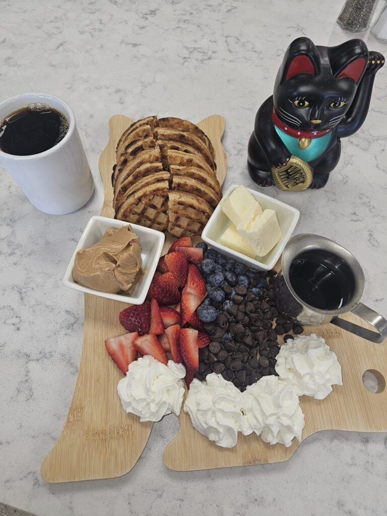 The Cattitude Cafe has a new featured menu with a Green Goddess vegetarian sandwich, a chicken bacon ranch wrap and a waffle board with strawberries, blueberries, chocolate chips, butter, maple syrup, peanut butter and whipped cream for toppings.