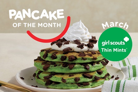 IHOP’s pancake of the month is quite seasonal: Girl Scouts Thin Mints. Four green buttermilk pancakes are topped with cheesecake mousse, Girl Scouts Thin Mints cookie pieces and whipped topping.