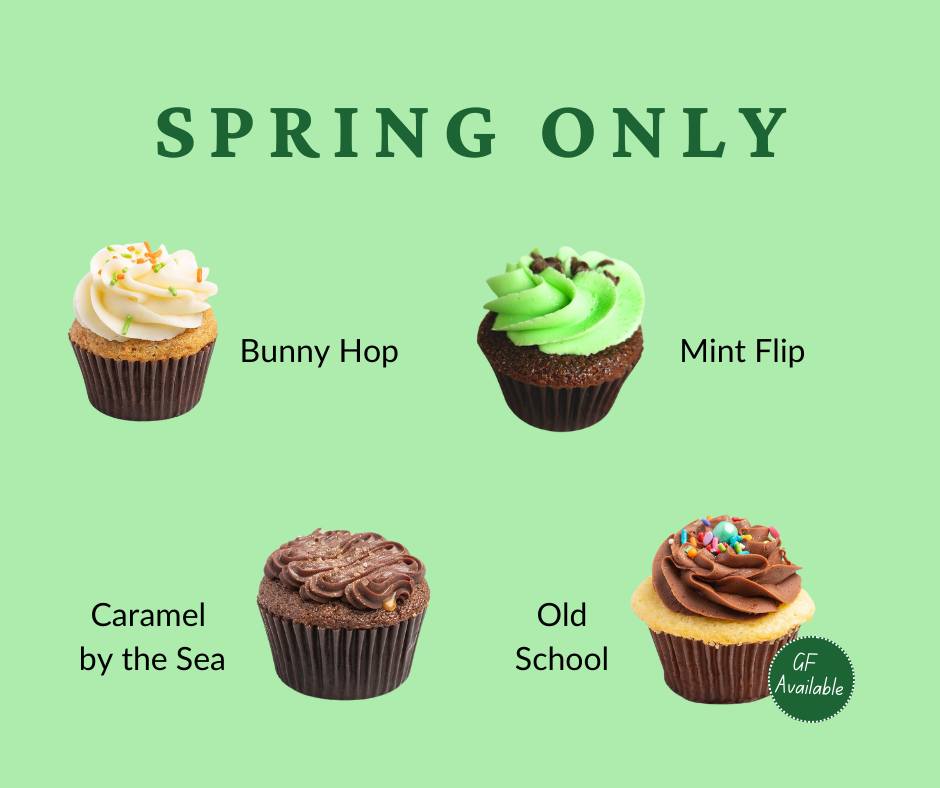 Oh My Cupcakes’ new spring flavors have arrived: Bunny Hop, Mint Flip, Caramel by the Sea, and Old School, which also comes in a gluten-friendly option.