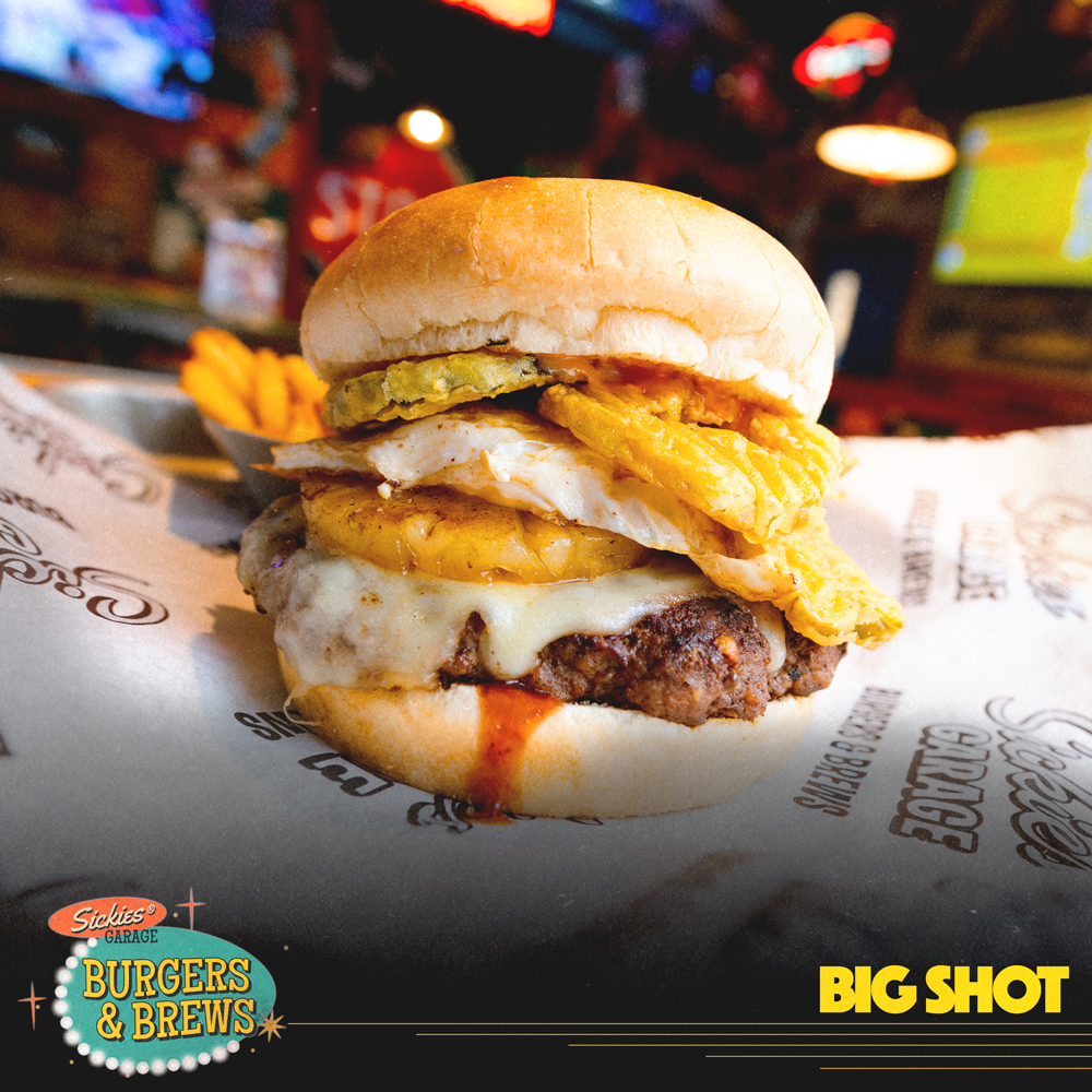 While putting pineapple on pizza can generate debate, a new burger at Sickies Garage Burgers & Brews likely won’t draw as much heat. Big Shot is among several new menu items. The burger is topped with provolone cheese, pineapple, fried egg, fried pickles, barbecue sauce and Sickies’ sauce.