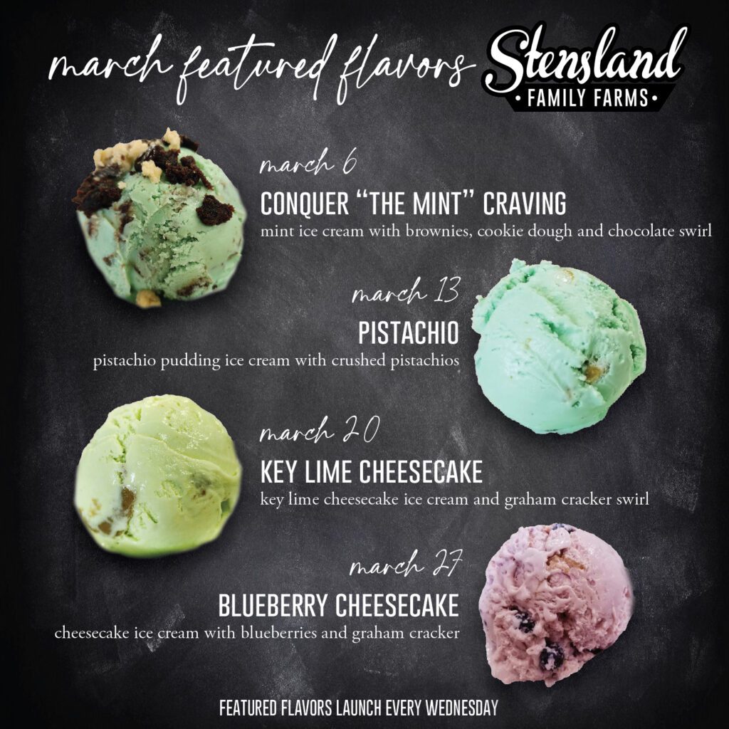 When Stensland Family Farms quit selling milk, it decided to make more ice cream flavors instead. Every Wednesday, it launches a new or seasonal flavor in its retail stores. Here are the upcoming flavors for March.