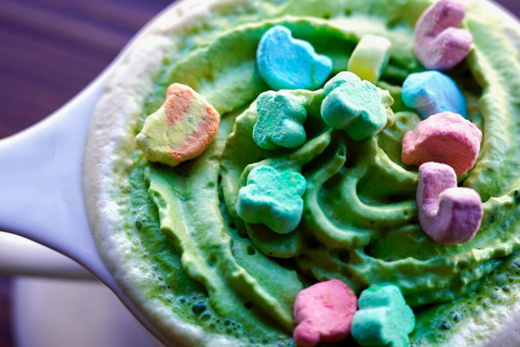 The Breaks Coffee Roasting Co. turned to Lucky Charms for one of its featured drinks this month. General Thrills has Lucky Charms-infused Oatly mixed with coffee, matcha whip and a cereal garnish. The other drink is Swamp Thing with Matcha Sonogi, San Pellegrino sparkling mineral water, elderflower and lemon simple syrup, gold dust and an orange chip garnish.