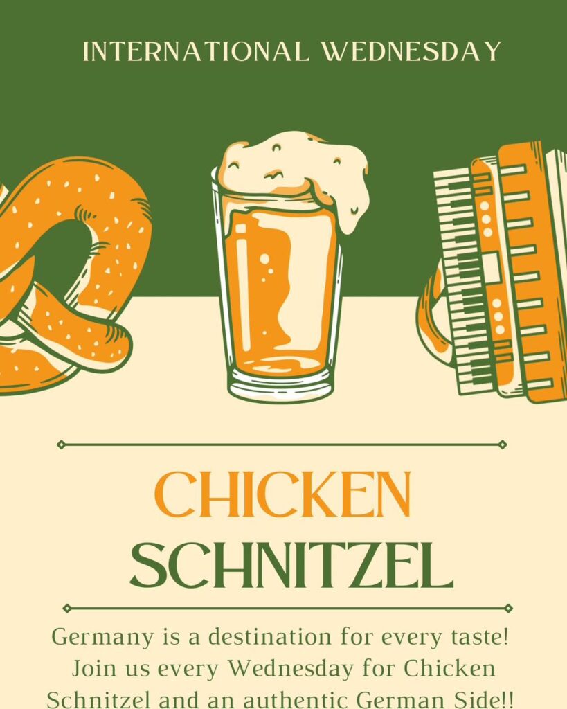 For International Wednesdays in March at The Willows, the dish is chicken schnitzel with German side dishes of roasted potatoes and fresh chopped cucumber. It’s served from 5 to 9 p.m.