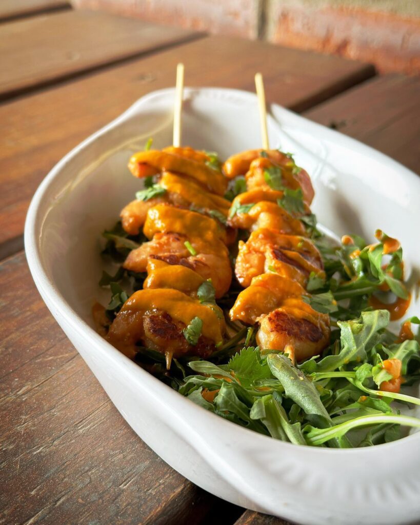 Bread & Circus Sandwich Kitchen has started featuring appetizers created by the chefs at sister company En Place Catering. A new item appears every month. For April, the special is red miso marinated shrimp skewers with a reduction of jjigae – or Korean stew — and cilantro over arugula.