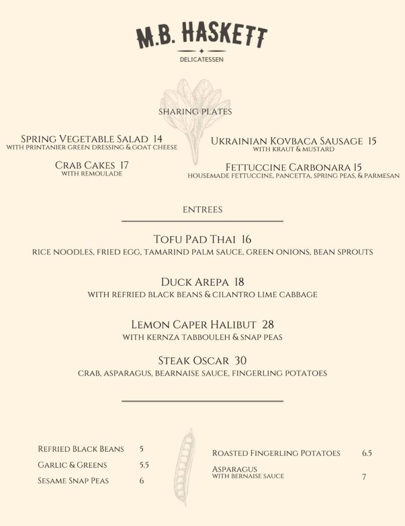 The spring dinner menu at M.B. Haskett Delicatessen will be available beginning tonight. It’s served from 5 to 9 p.m. Thursday through Saturday.
