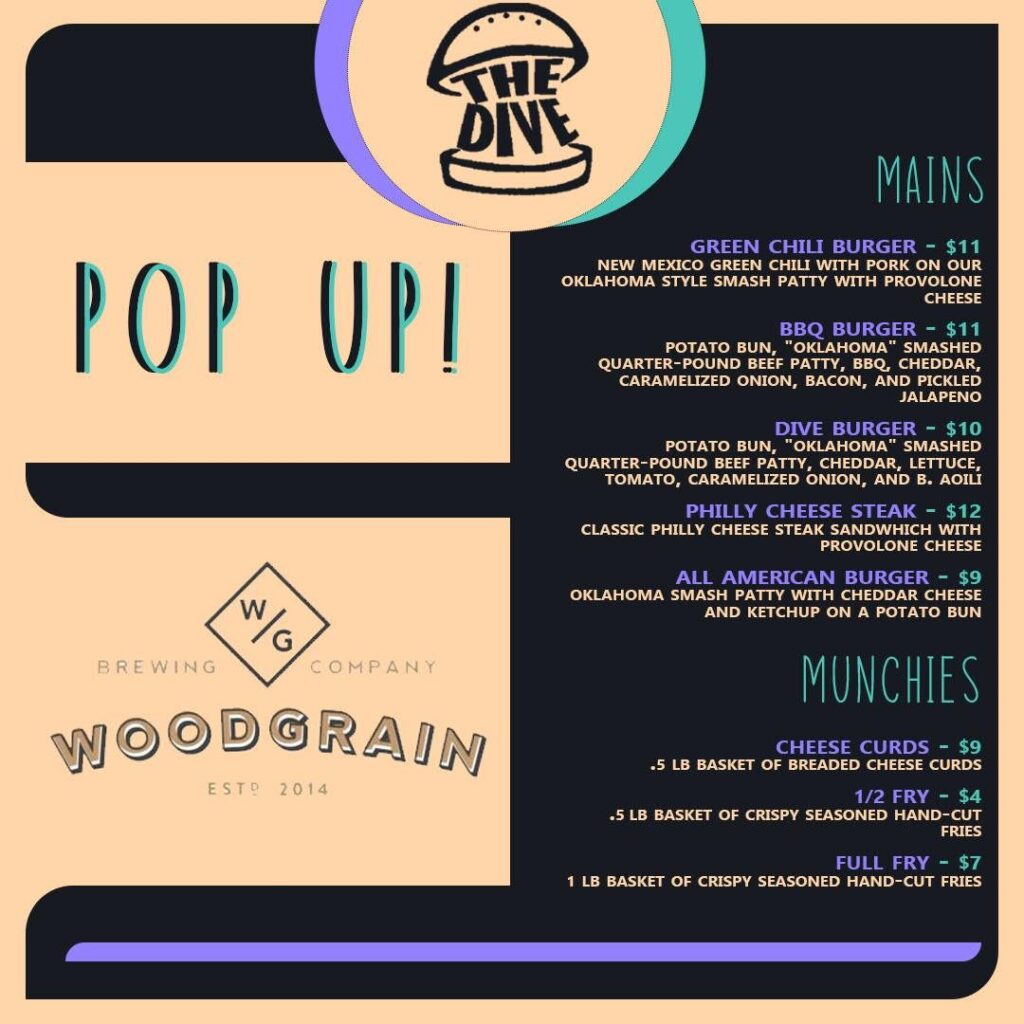 The Dive will hold its next pop-up at WoodGrain Brewing July 8. It runs from 4 to 9 p.m. Check out the menu here: