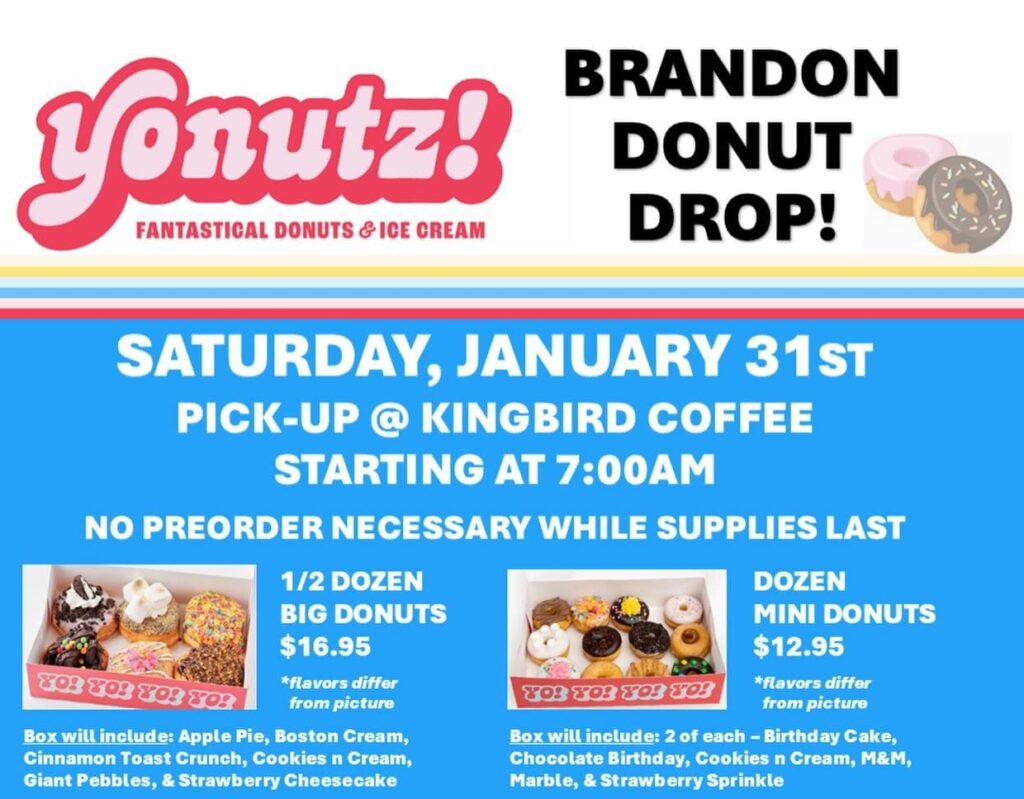 Kingbird Coffee in Brandon is having another Yonutz doughnut drop on Saturday. Get a half-dozen big doughnuts or a dozen mini ones while supplies last. Customers also can pre-order and select their favorites from the Yonutz menu by going on the app or online at yonutz.com, selecting the Sioux Falls store and choosing a pickup time of 8:20 a.m. Saturday – that’s how the crew will know the doughnuts need to go to Brandon. They’ll be there by 7 a.m. The deadline for pre-orders is 5 p.m. Friday.