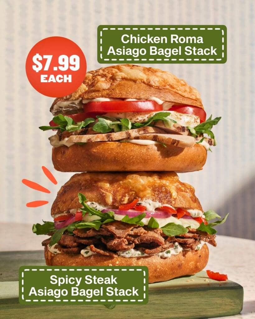 Asiago Bagel Stacks are back at Panera Bread. Chicken Roma and Spicy Steak Asiago are permanent menu items at lunch and dinner for $8. In the morning, diners can choose from three new Breakfast Bagel Stacks on either the signature asiago bagel or new asiago everything bagel. Breakfast choices are Wake-up BLT, Farmhouse Duo and Sausage & Egg. Also new are Asiago Croissant Twists, made for snacking or dipping in soup.