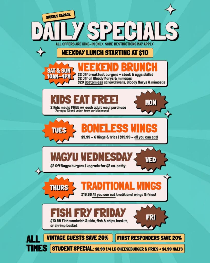 Sickies Garage Burgers & Brews has new daily specials.