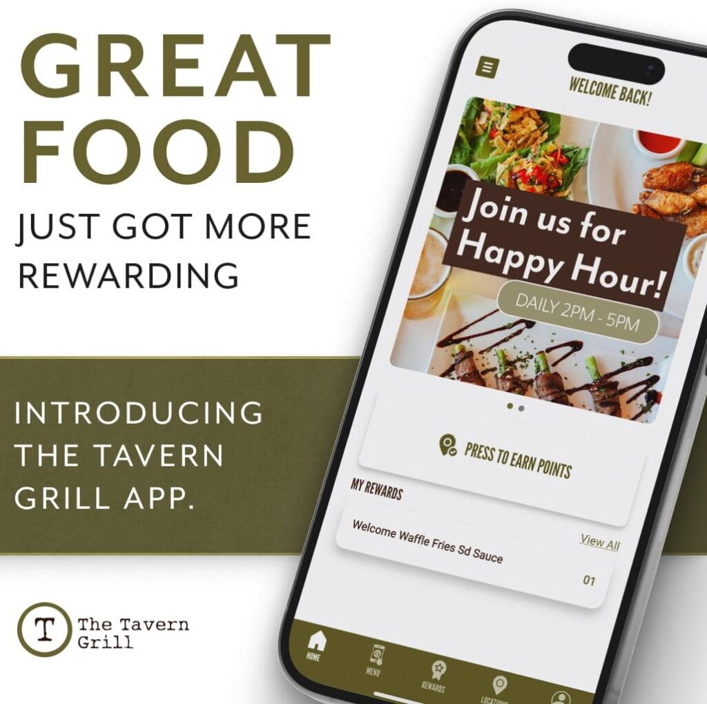 The Tavern Grill has a new app to use for ordering takeout, earning rewards, accessing exclusive perks and unlocking special offers. Get a free side of waffle fries for joining. Download from the Apple App Store or Google Play Store. If you’re already a reward member, just reset your password to get started.