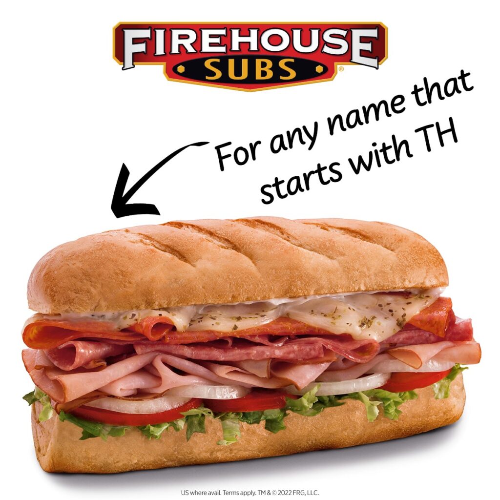 The Name of the Day free sub promotion is back at Firehouse Subs. For a limited time, the restaurant posts a name or the start of a name each day, and anyone with that name gets a free medium sub with any purchase. Thursday’s kickoff was any name starting with “Th.” Find the name of the day here.