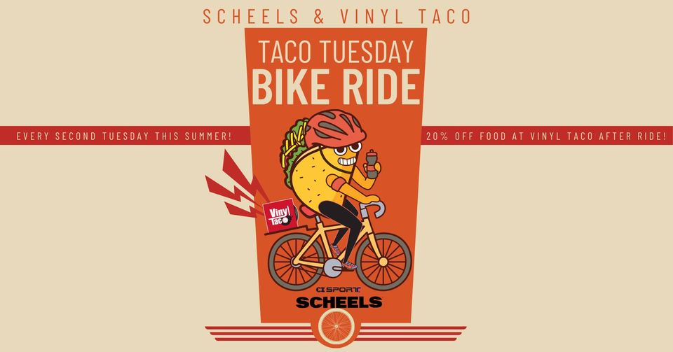 Taco Tuesday Rides are back at Scheels and Vinyl Taco, starting May 10. The rides and taco feasts are on the second Tuesday of the month this summer. Meet at the Scheels south entrance at 5:45 p.m. The group will head out to ride the bike trail at 6 p.m. and then come back to Vinyl Taco just south of Scheels for 20 percent off food.